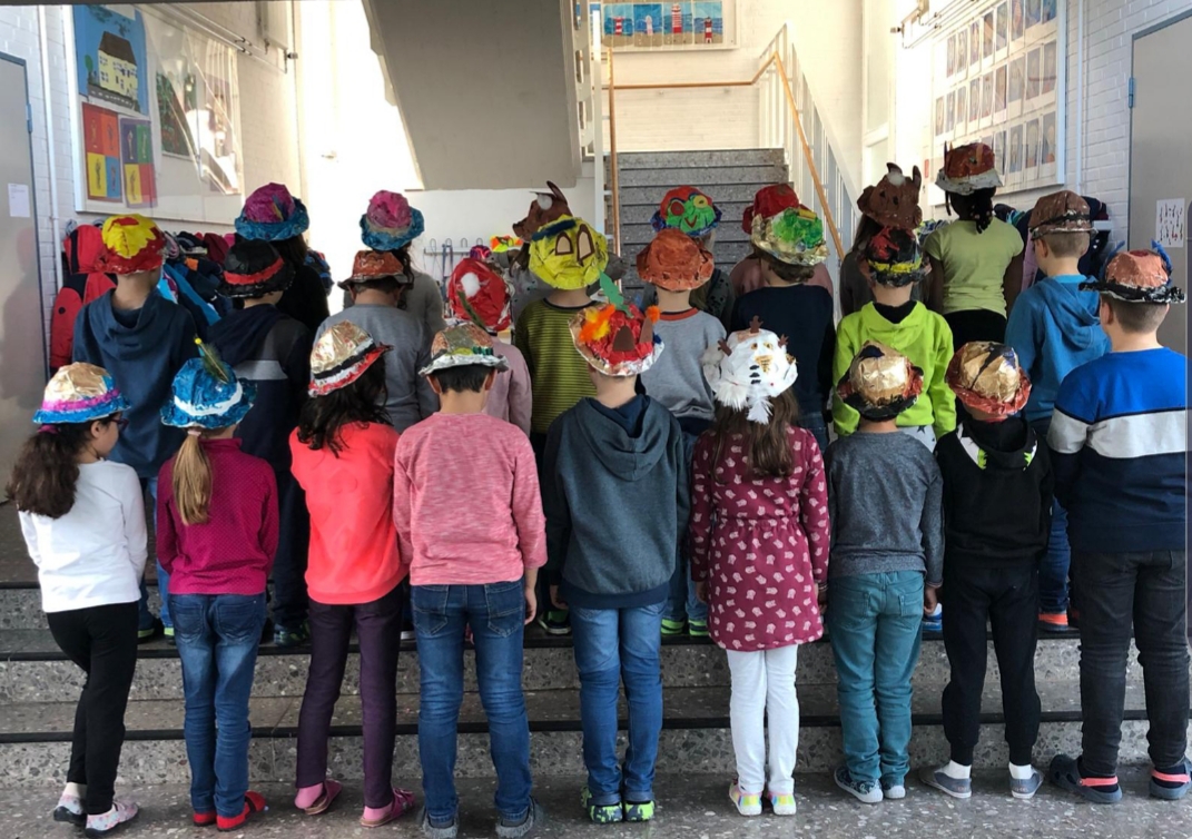 Zu diesem Thema entwarfen die Kinder der Klasse 2c im Kunstunterricht ihre eigenen Hutkreationen. Aus Zeitungspapier und Klebeband entstanden individuelle Hüte, die schließlich mit Farben bemalt und mit unterschiedlichen Materialien verziert wurden.