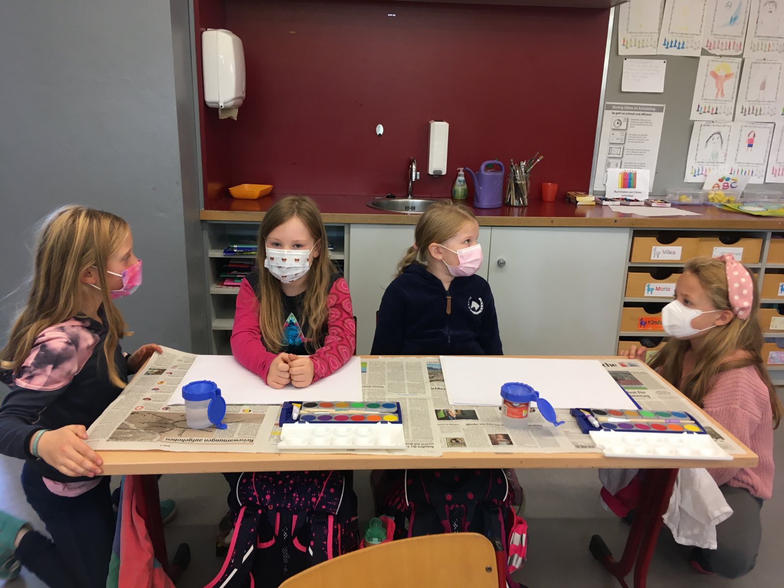 Unterstützung im Kunstunterricht gab es für die 1a letzte Woche durch die Patenklasse. Die Patinnen und Paten haben für die Erstklässler alles vorbereitet, um zum ersten Mal mit den Wasserfarben zu malen. Gestaltet wurden bunte „Teppiche für den Sonnenkönig“.