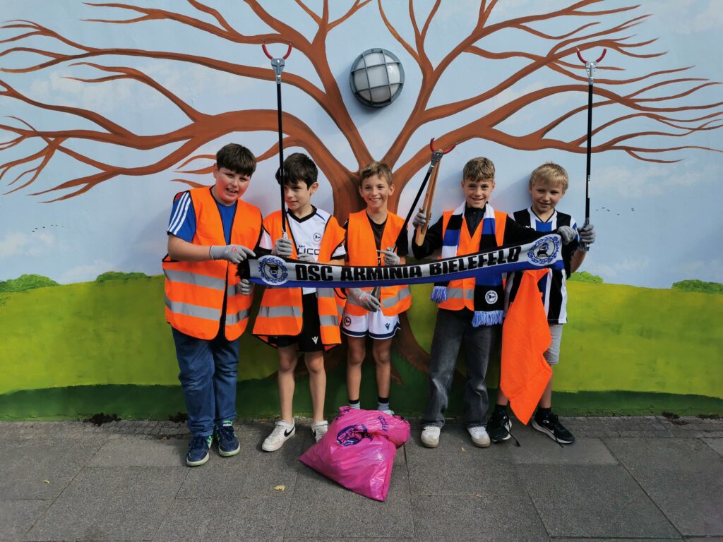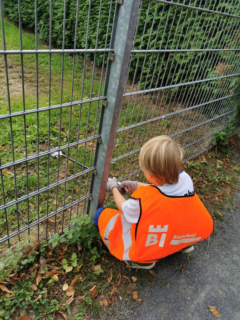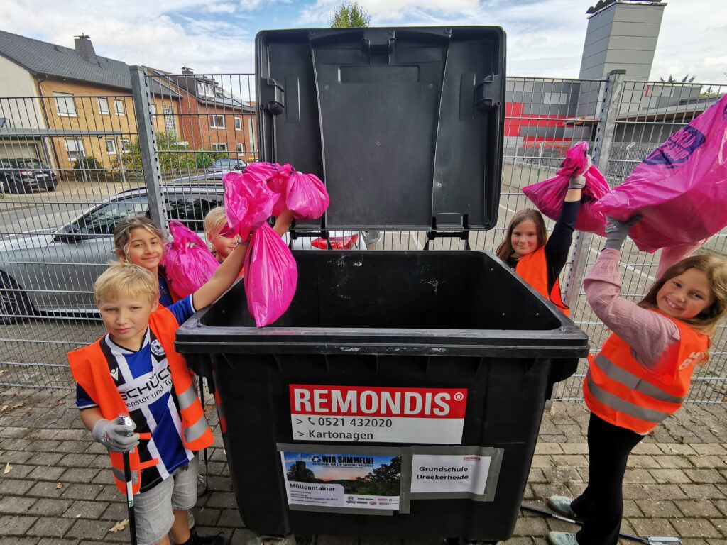 Komplett ausgerüstet mit Warnwesten, Handschuhen, Müllgreifern und natürlich Müllsäcken sind unsere Klassen losgezogen und haben begeistert die Müll-Sammelaktion von Arminia Bielefeld unterstützt. Rund um die Dreekerheide und auch auf dem Schulhof haben die Kinder vom ersten bis zum vierten Schuljahr in den letzten Tagen Müll eingesammelt. Dabei ist einiges zusammengekommen! In den kleinen Straßen um die Schule herum mussten unsere Kinder zum Glück ganz schön genau hinsehen und suchen. An manchen Stellen, besonders in den Grünstreifen und im Wald, haben die Kinder jedoch erschreckend viel Müll gefunden! Toll, dass alle so eifrig gesammelt und alles zur Schule geschleppt haben! Dort wurden alle Müllsäcke in der großen Tonne gesammelt und von der Stadt abgeholt. Der Müll, den alle teilnehmenden Schulen gesammelt haben, wird gewogen. Wir sind gespannt, wie viel da zusammen kommt!